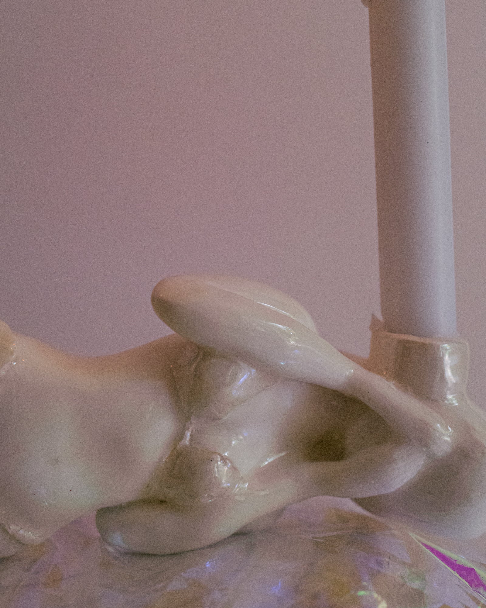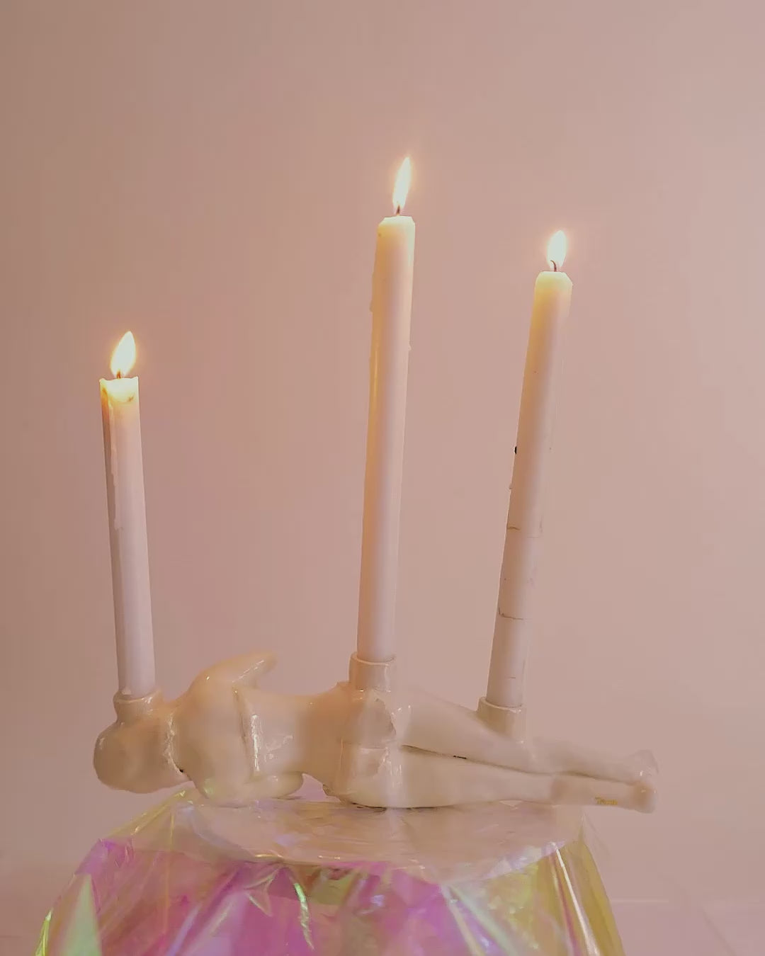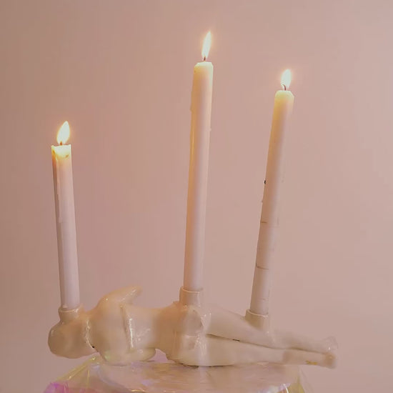 Cette sculpture-bougeoir est une ode à la lumière incarnée. Le corps féminin, allongé avec grâce, devient socle pour trois flammes verticales. Le contraste entre la horizontalité paisible du corps et la verticalité des cierges suggère une tension entre repos et élévation. Les détails nacrés sur la lingerie et les supports ajoutent une touche sacrée et sensuelle.