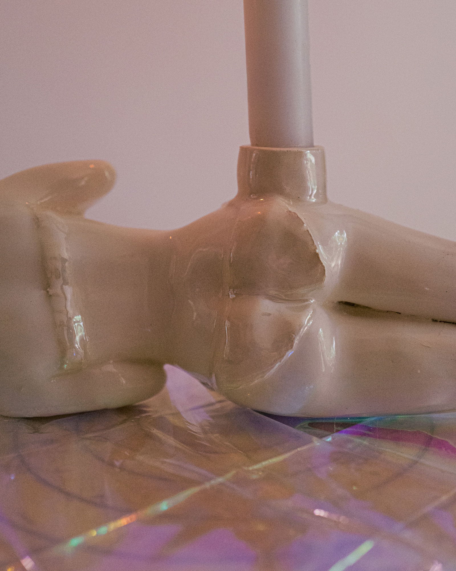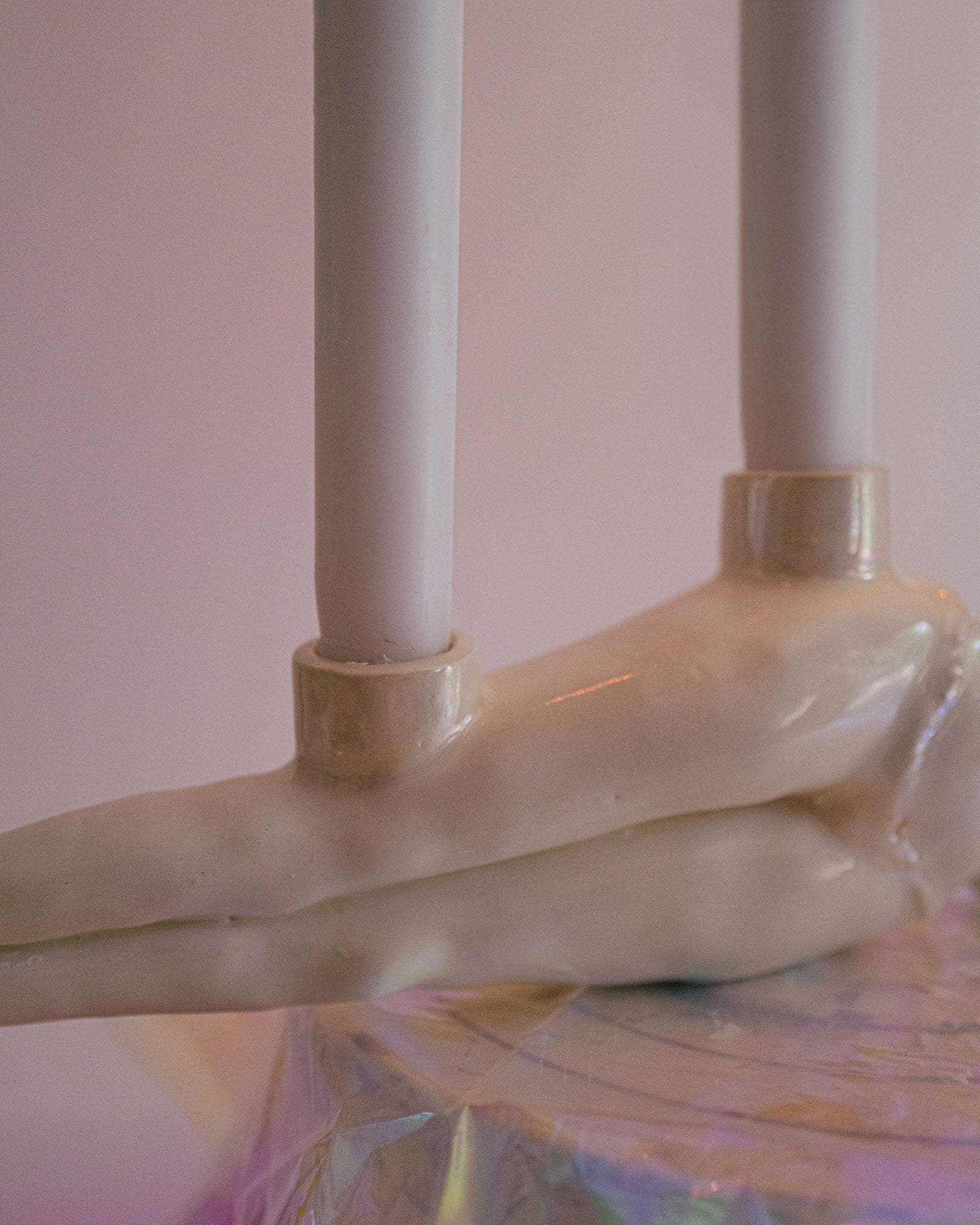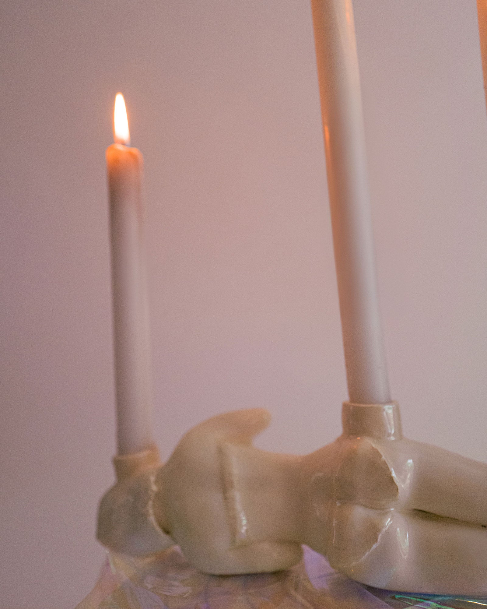 Cette sculpture-bougeoir est une ode à la lumière incarnée. Le corps féminin, allongé avec grâce, devient socle pour trois flammes verticales. Le contraste entre la horizontalité paisible du corps et la verticalité des cierges suggère une tension entre repos et élévation. Les détails nacrés sur la lingerie et les supports ajoutent une touche sacrée et sensuelle.
