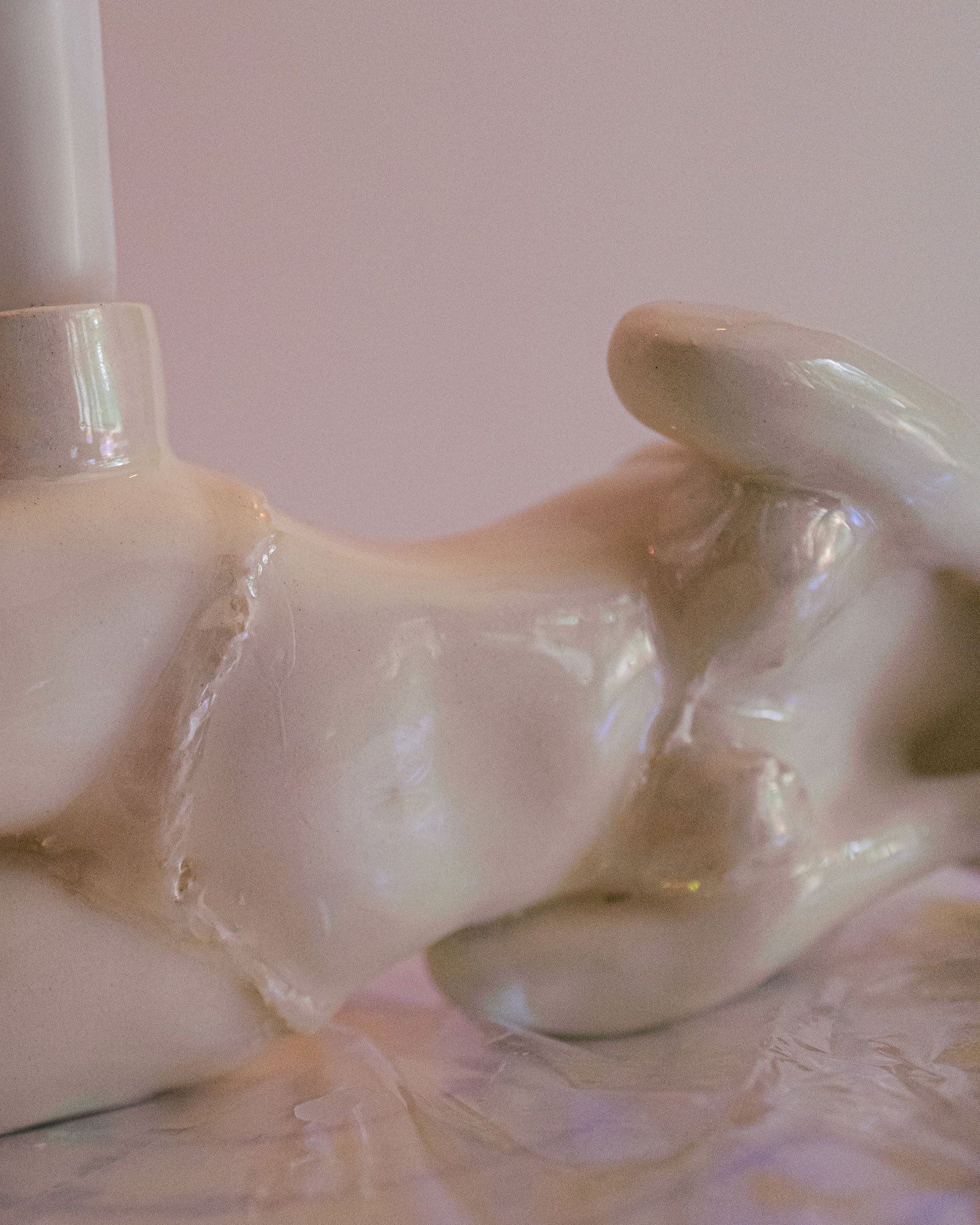 Sculpture modelée à la main - trois porte-bougies intégrés dans la silhouette d’un corps féminin allongé - émaillage brillant ivoire, avec lustre nacré subtil sur les sous-vêtements et les porte-bougies - finition douce, pièce signée.