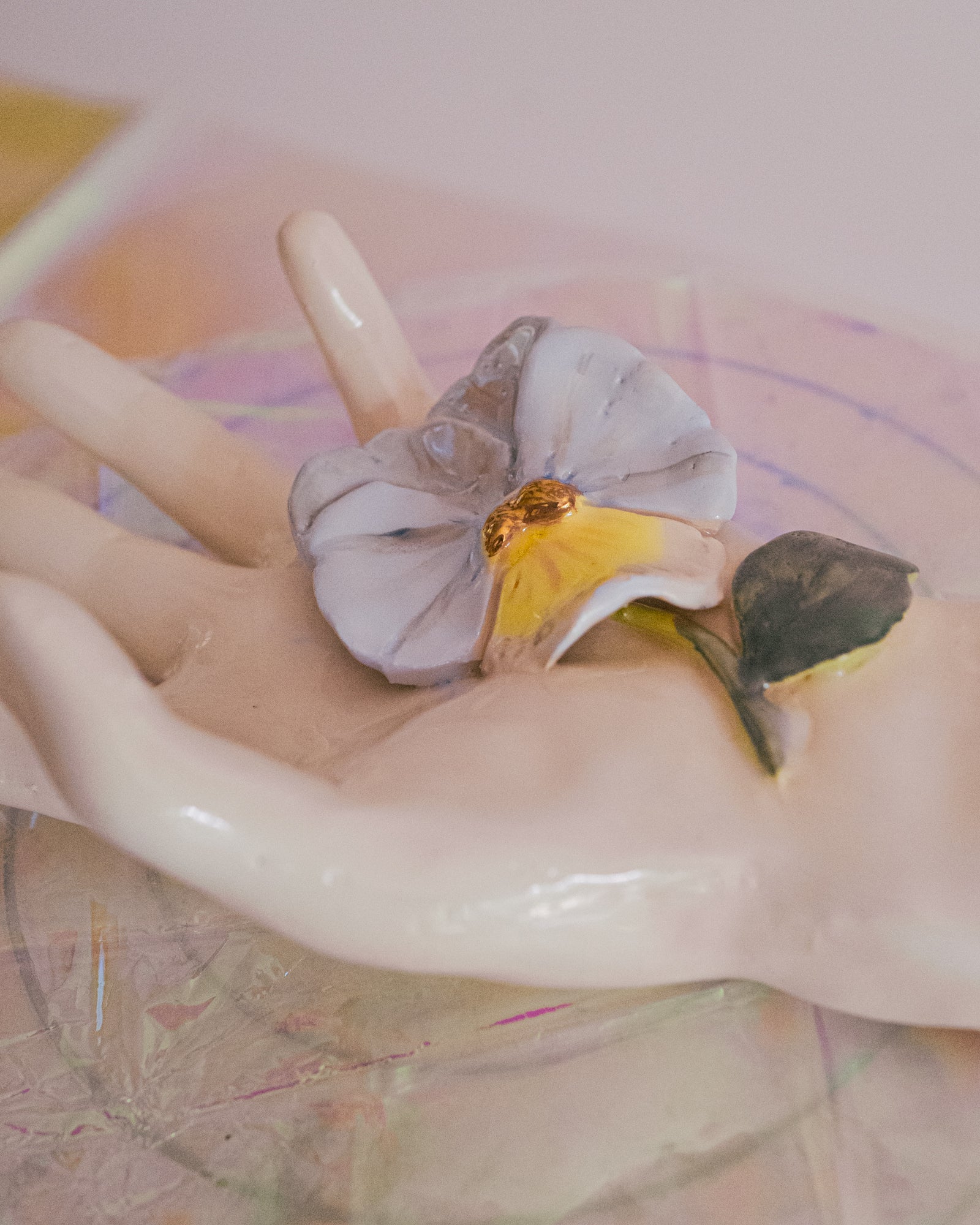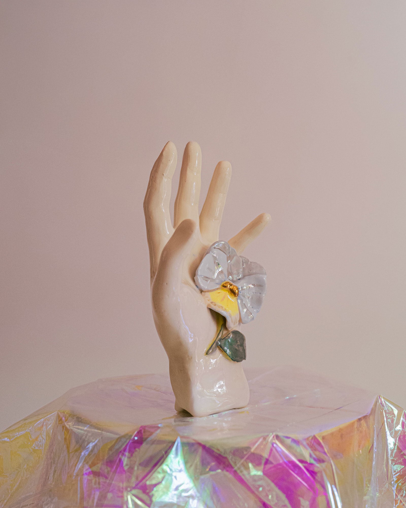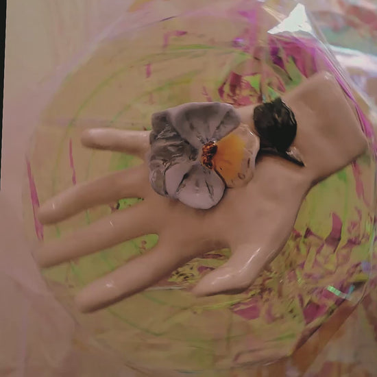 Cette main, suspendue entre offrande et recueil, tient une pensée délicate. Cette fleur associée au souvenir, à la tendresse et à l’âme. La pièce joue entre la puissance du geste et la fragilité florale, dans une esthétique douce et spirituelle. À poser sur un autel personnel, une étagère poétique ou à accrocher au mur comme un ex-voto contemporain : elle devient presque une icône moderne, une offrande silencieuse.
