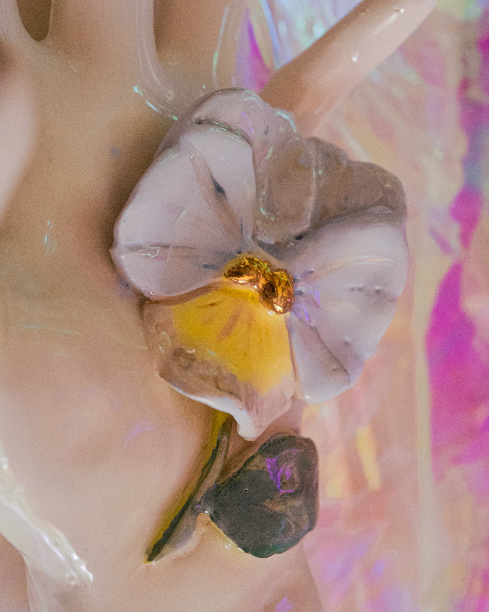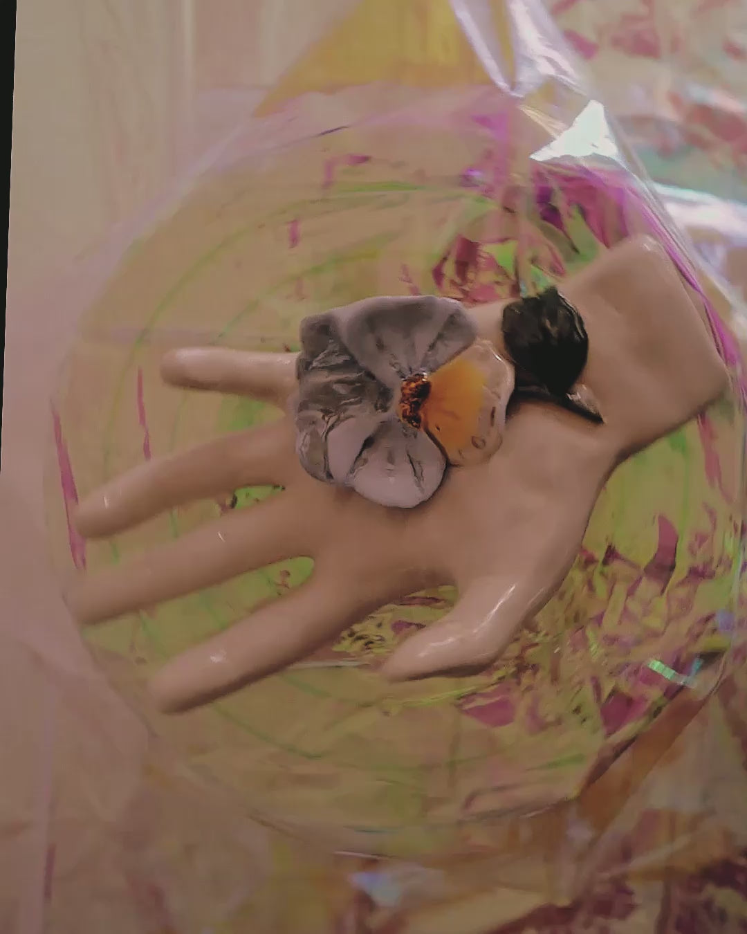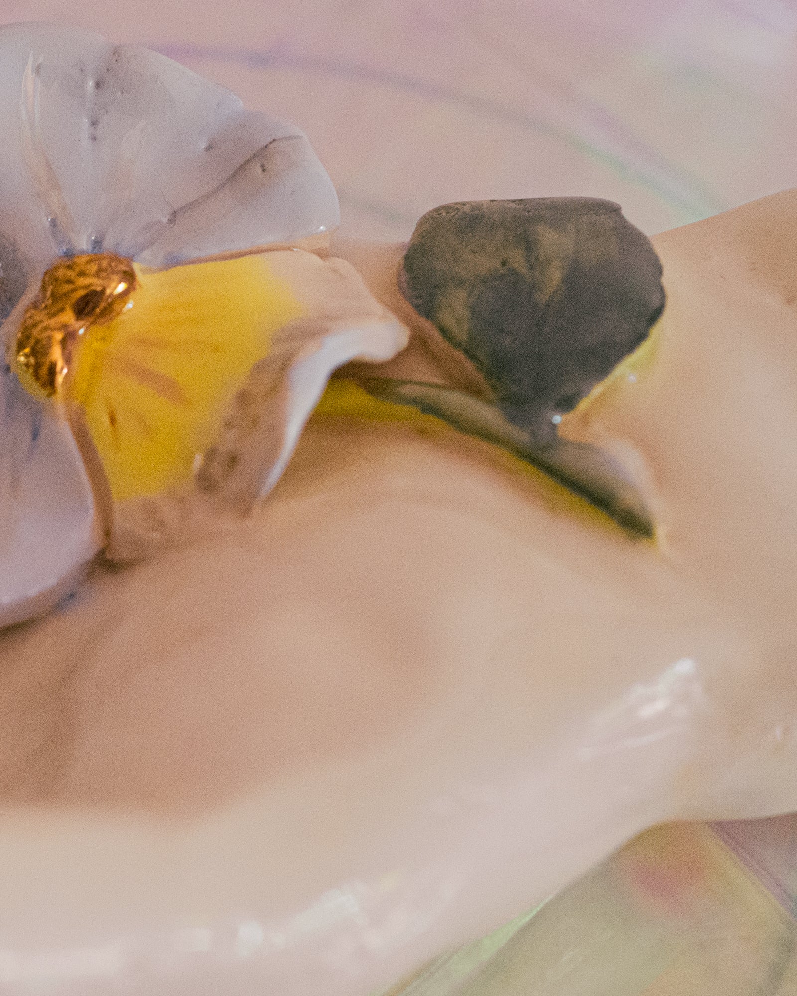Cette main, suspendue entre offrande et recueil, tient une pensée délicate. Cette fleur associée au souvenir, à la tendresse et à l’âme. La pièce joue entre la puissance du geste et la fragilité florale, dans une esthétique douce et spirituelle. À poser sur un autel personnel, une étagère poétique ou à accrocher au mur comme un ex-voto contemporain : elle devient presque une icône moderne, une offrande silencieuse.