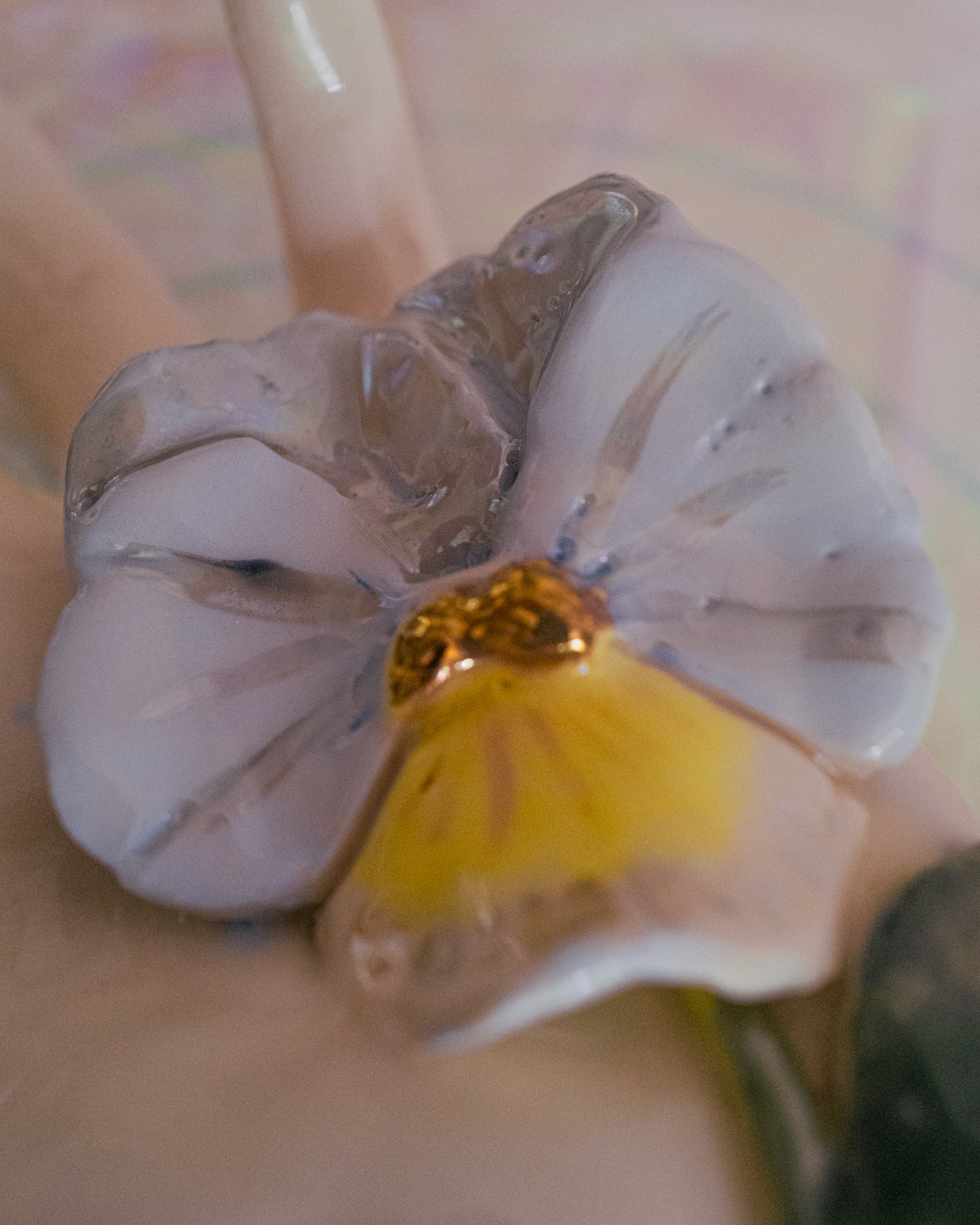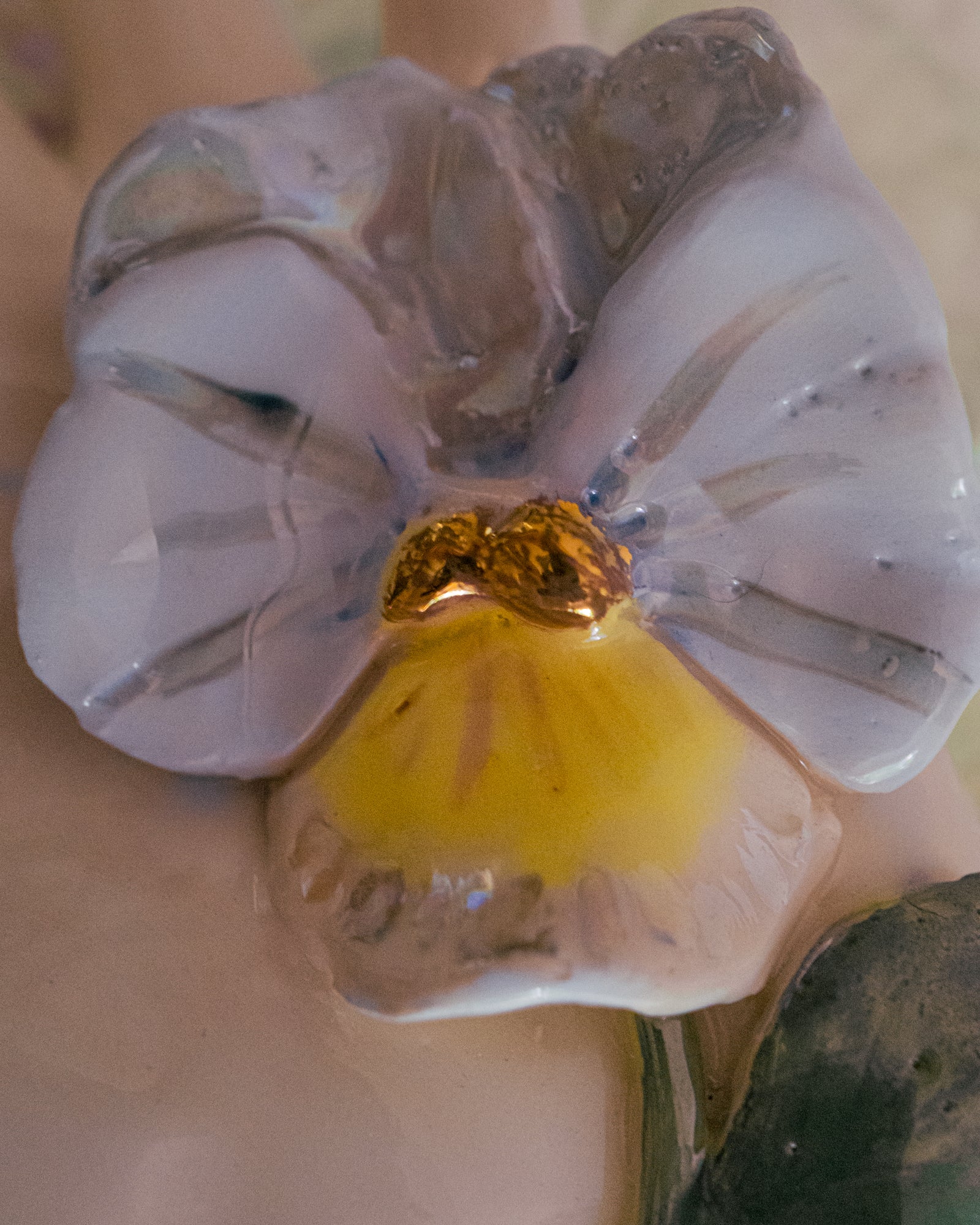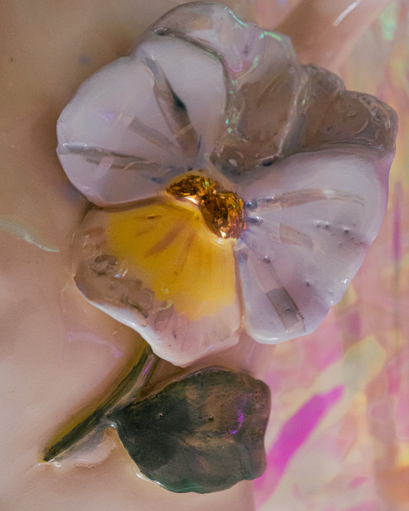 Sculpture murale ou à poser - modelée à la main - émaillée brillante, ornée d’une pensée en relief - détails en lustre irisé et rehauts d’or véritable sur le cœur de la fleur - trou de fixation à l’arrière prévu pour un accrochage mural.