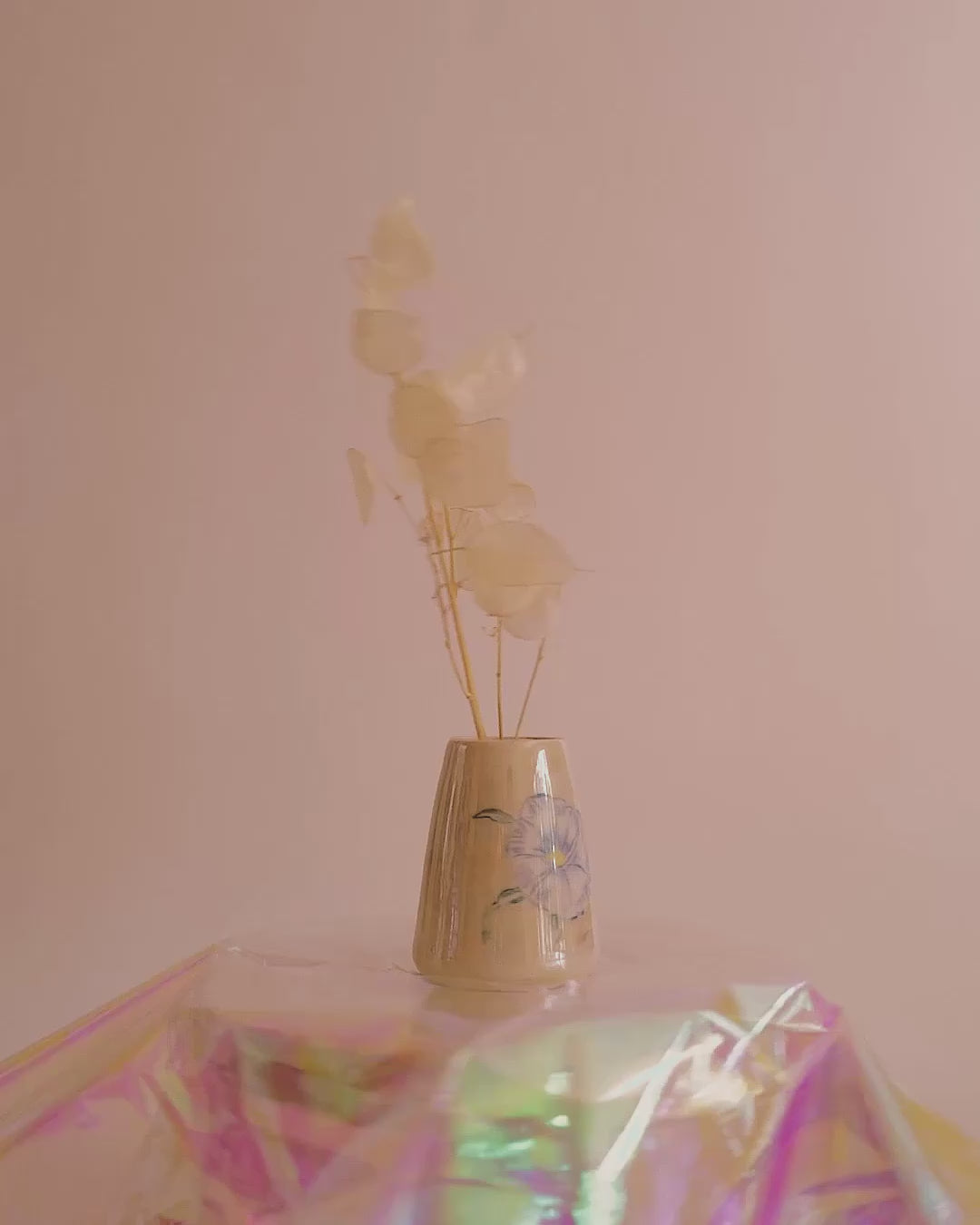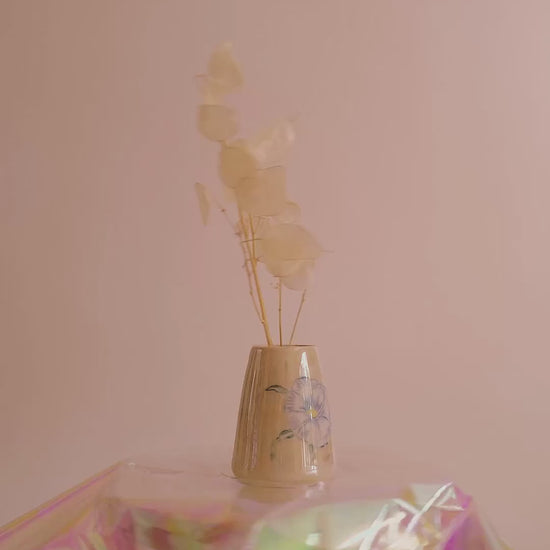 Vase en faïence tourné à la main - émaillage brillant - décor au crayon à oxyde bleu représentant une ipomée - détails lumineux en lustre irisé, appliqués à la main - entièrement étanche, adapté à l’eau ou aux fleurs séchées.
