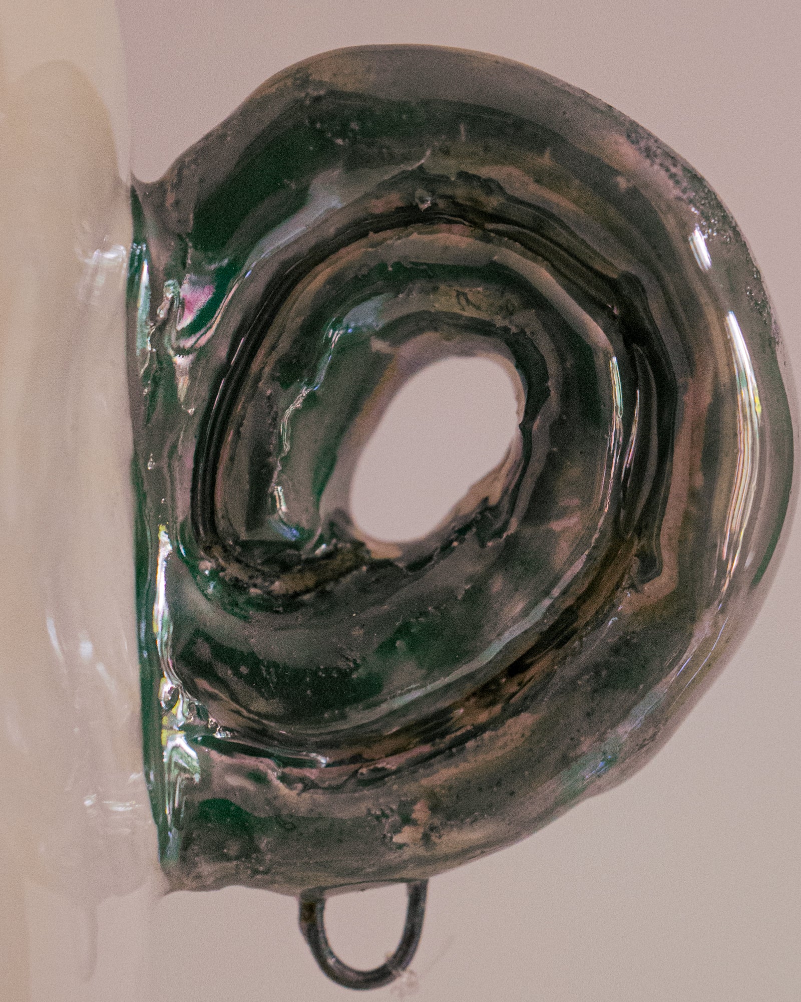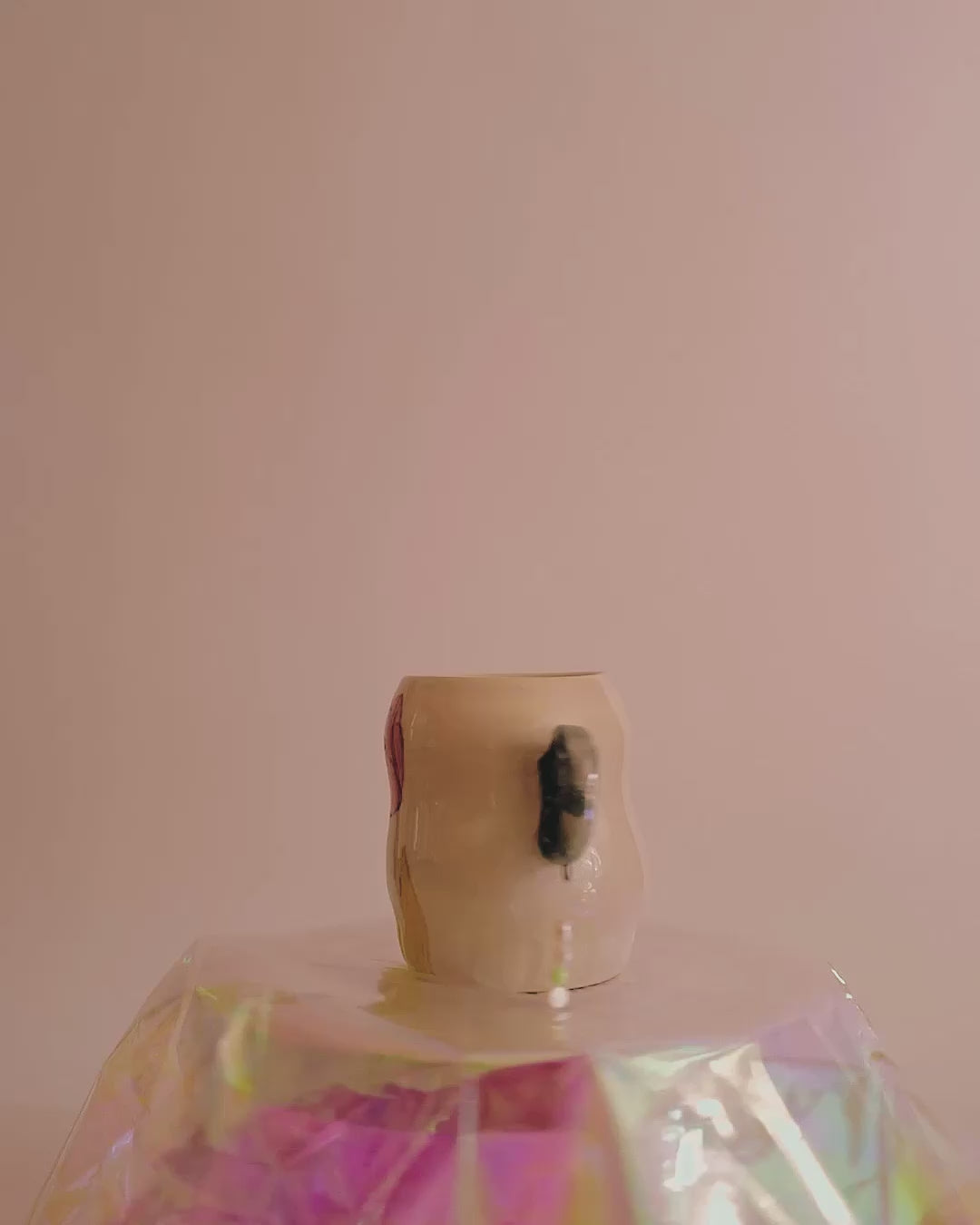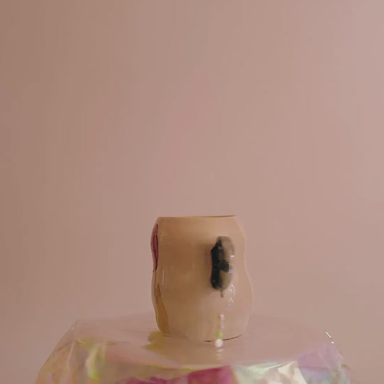 Ce mug sculptural joue avec les codes du vase, du bijou et du quotidien. Deux anses en forme de spirale, recouvertes de lustre irisé, évoquent des boucles d’oreilles anciennes. À chacune est suspendue une petite chaîne de perles, ajoutant un effet précieux et poétique. Sur le corps, une tulipe délicate, dessinée à l’oxyde rose et vert, célèbre la beauté fragile des fleurs printanières. Idéal comme tasse décorative, petit vase ou objet de collection.