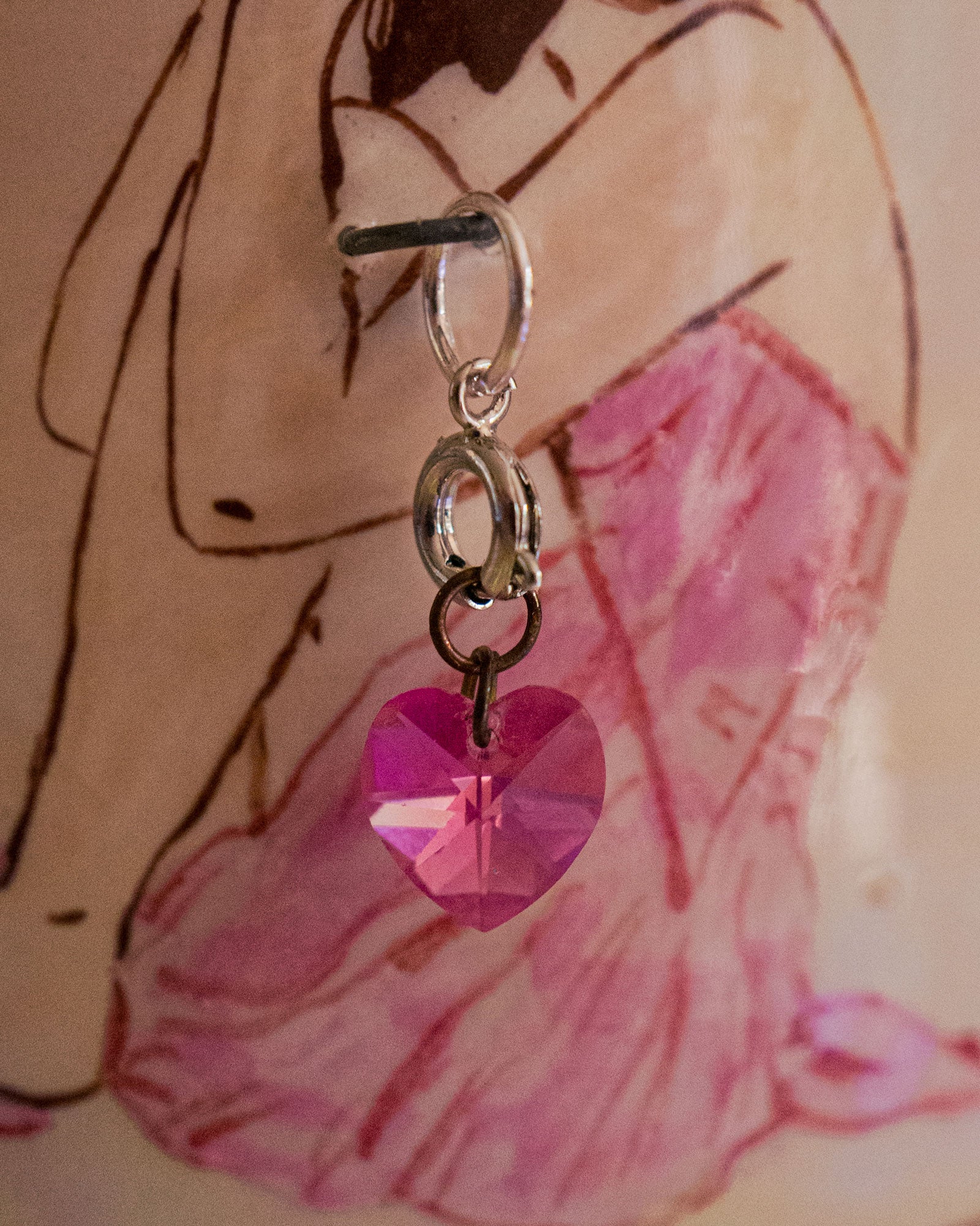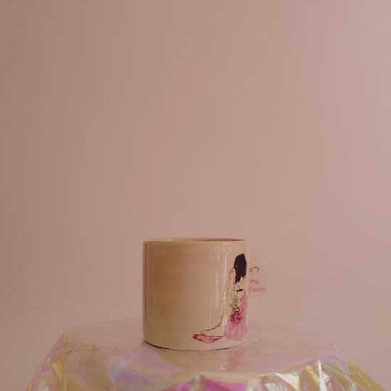 Cette tasse raconte une prière silencieuse. Une figure agenouillée, peinte avec douceur, s’efface presque dans la matière, mais son geste parle. Un bijou pend sur son profil, comme un cœur battant. La anse devient une prière “Dona nobis pacem”, comme un vœu suspendu dans l’argile.