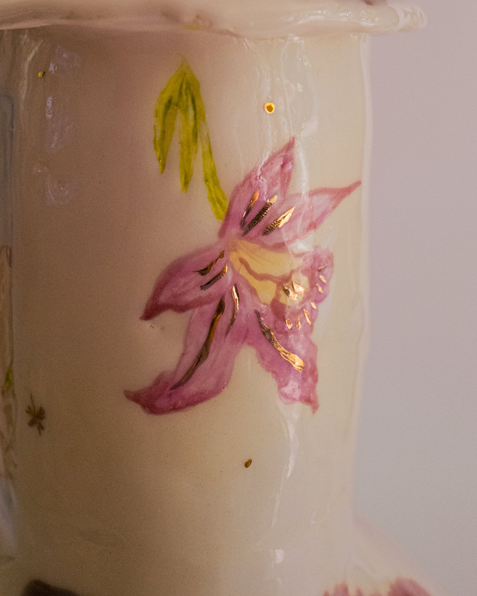 Réalisé entièrement à la main - terre émaillée brillante - chaque illustration est unique et réalisée à la main - écritures manuscrites - présence d’or véritable posé au pinceau (lustre) - papillons en céramique 3D ajoutés à la main - non étanche à 100 % : à utiliser avec une pipette intérieure (ou petit pot) ou pour des fleurs séchées